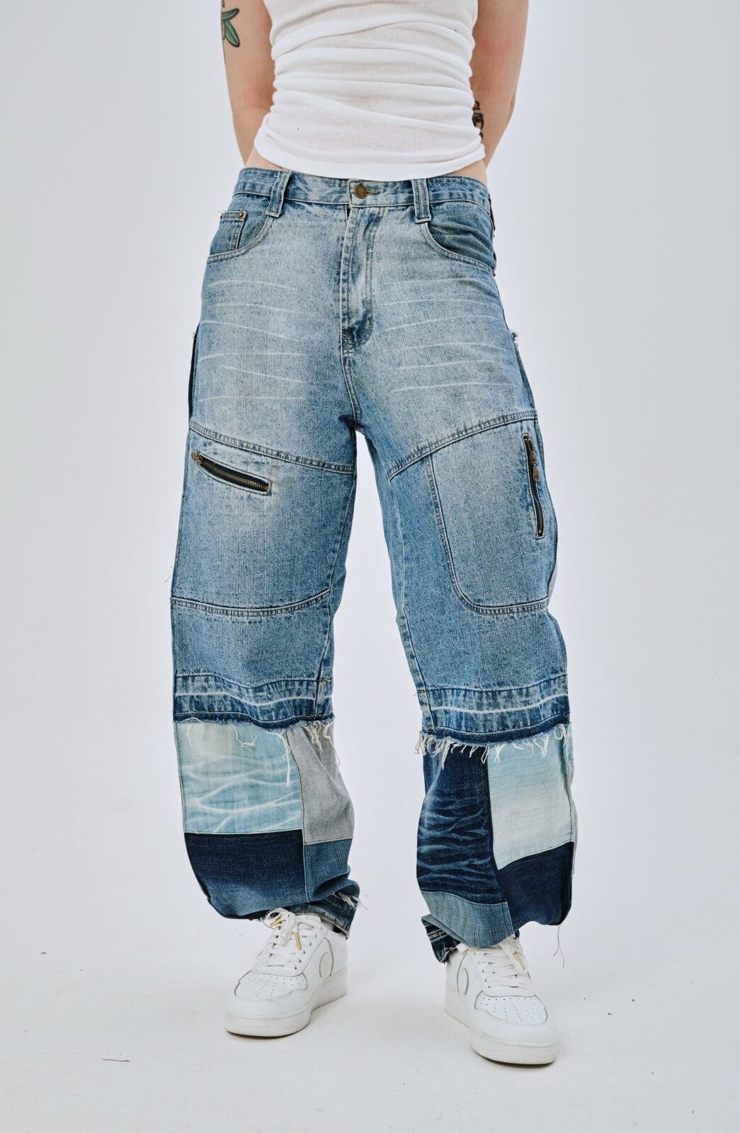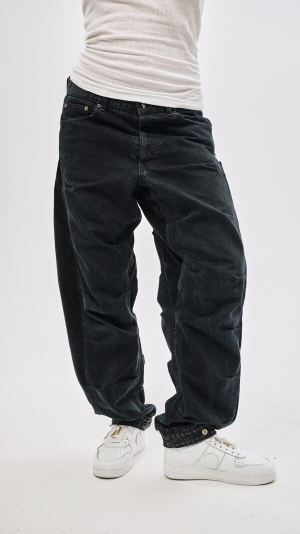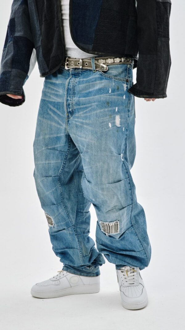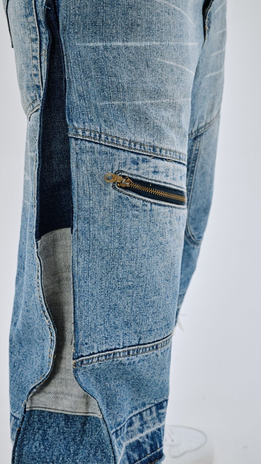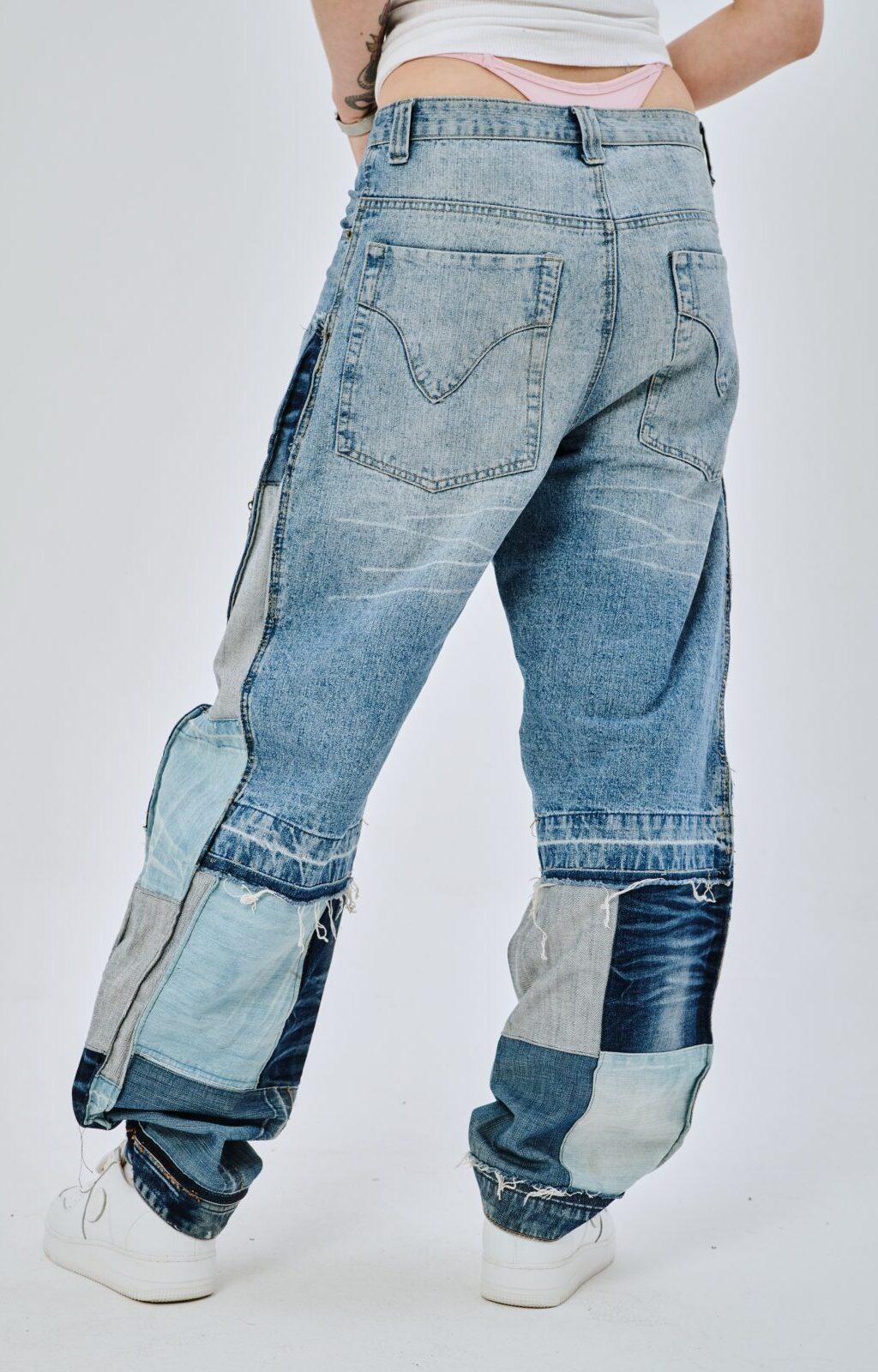 Сэмпл джинсов, выполненный вручную дизайнером distxrtedcustom. Шахматный орнамент на расширениях по бокам и в нижней части джинс. Строчки по бокам изделия придают геометрическую форму штанинам. Ручная работа и семпловый формат изделия объясняют привлекательную стоимость.