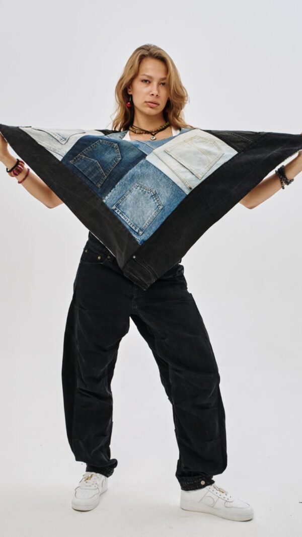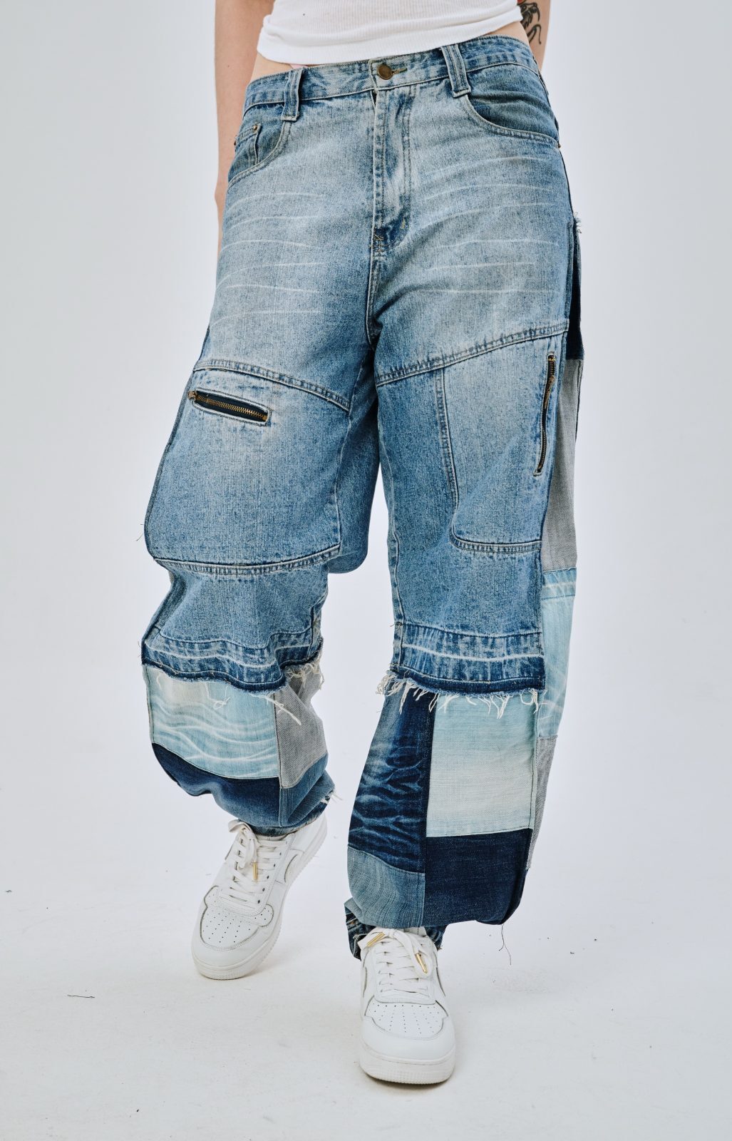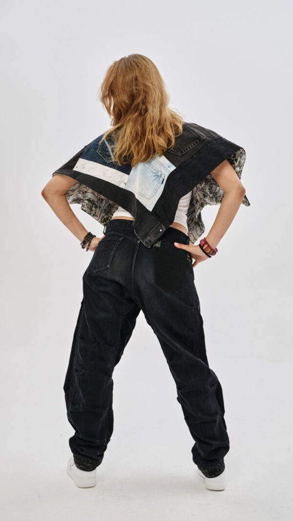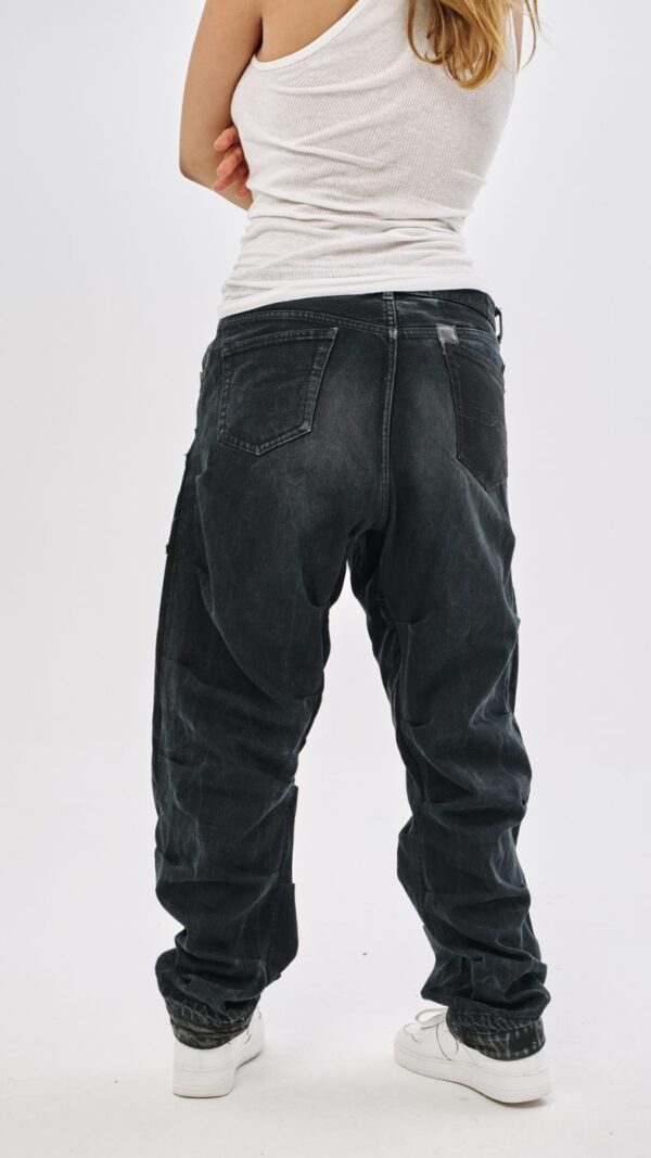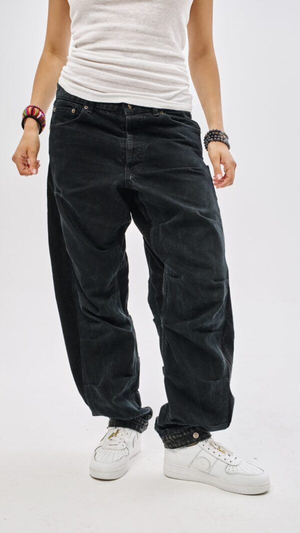 Сэмпл джинсов, выполненный вручную дизайнером distxrtedcustom. Шахматный орнамент на расширениях по бокам и в нижней части джинс. Строчки по бокам изделия придают геометрическую форму штанинам. Ручная работа и семпловый формат изделия объясняют привлекательную стоимость.