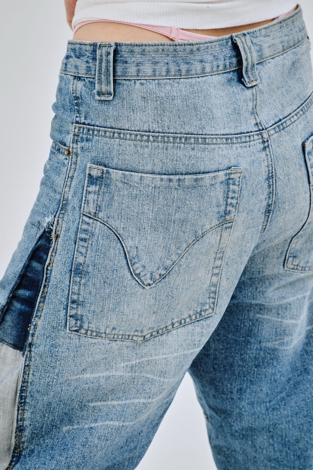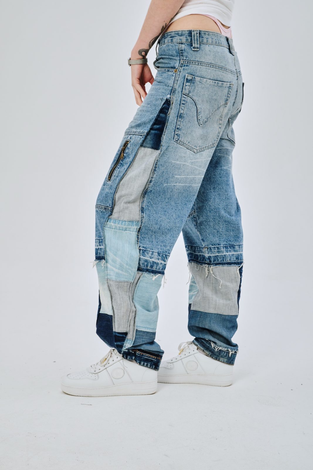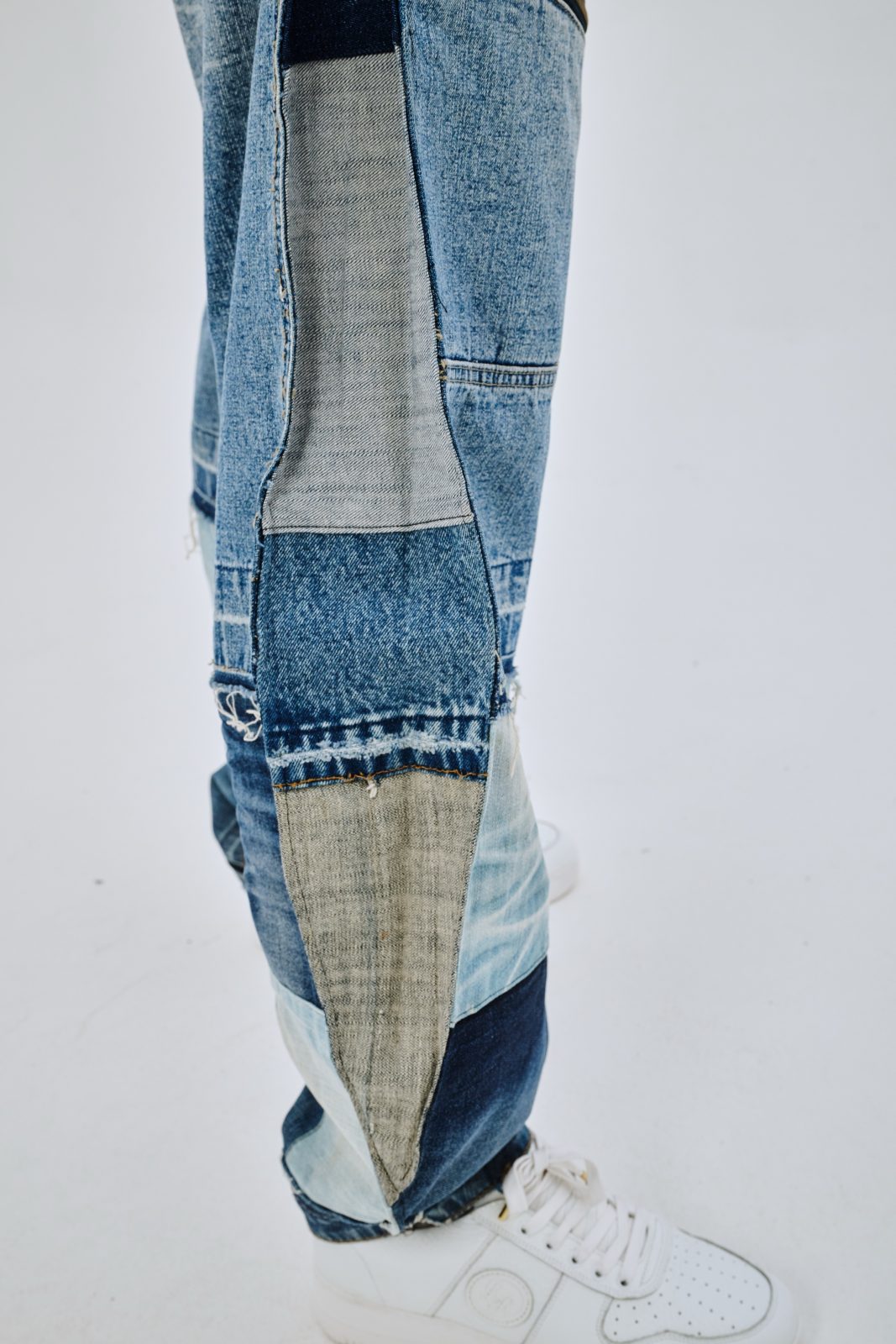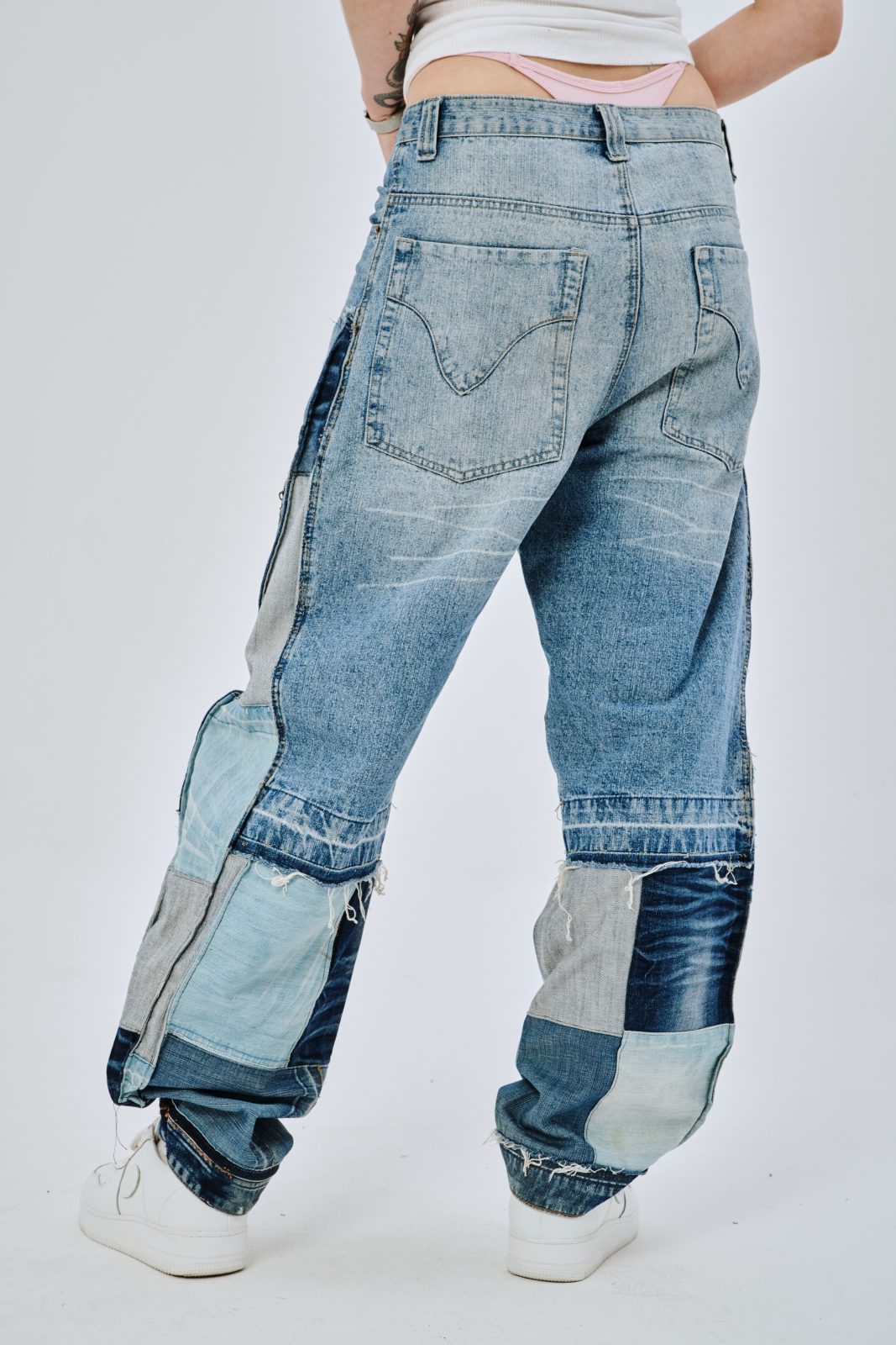 Сэмпл джинсов, выполненный вручную дизайнером distxrtedcustom. Шахматный орнамент на расширениях по бокам и в нижней части джинс. Строчки по бокам изделия придают геометрическую форму штанинам. Ручная работа и семпловый формат изделия объясняют привлекательную стоимость.