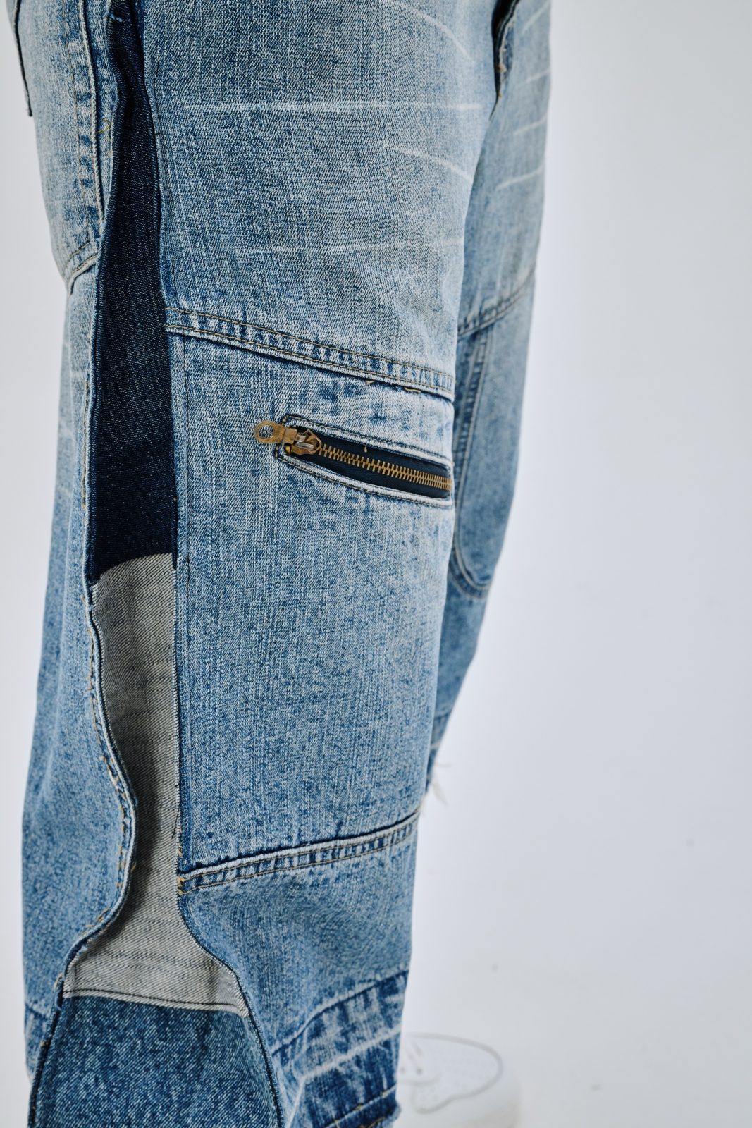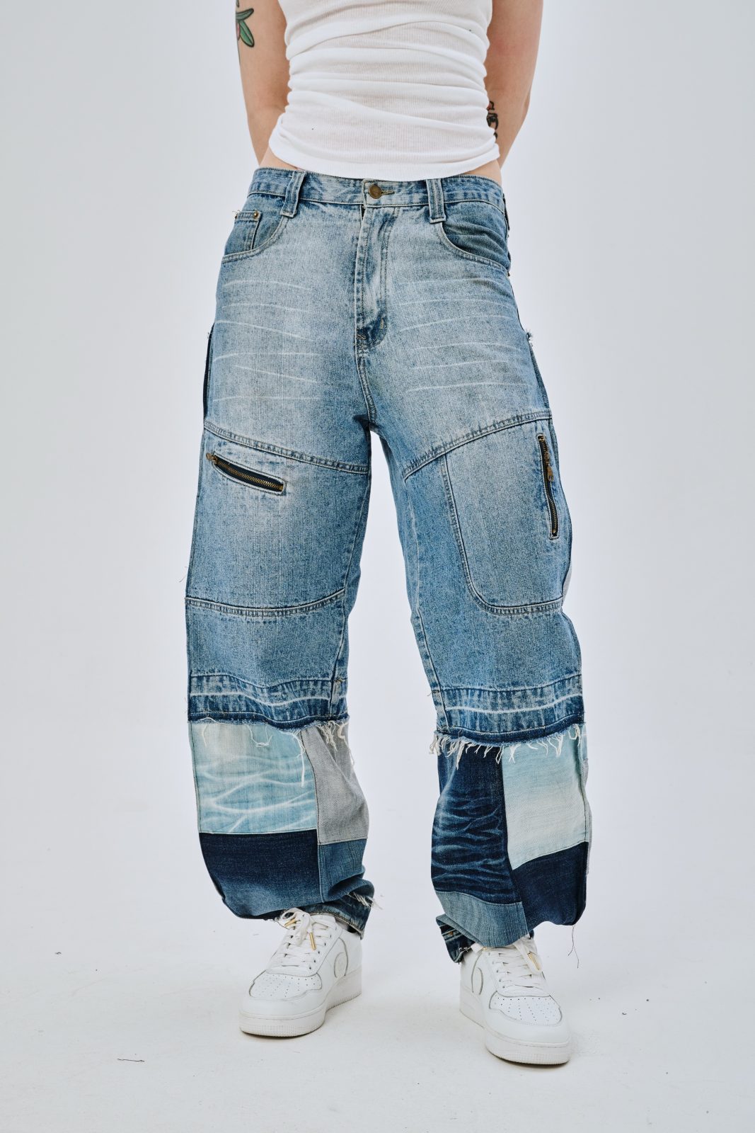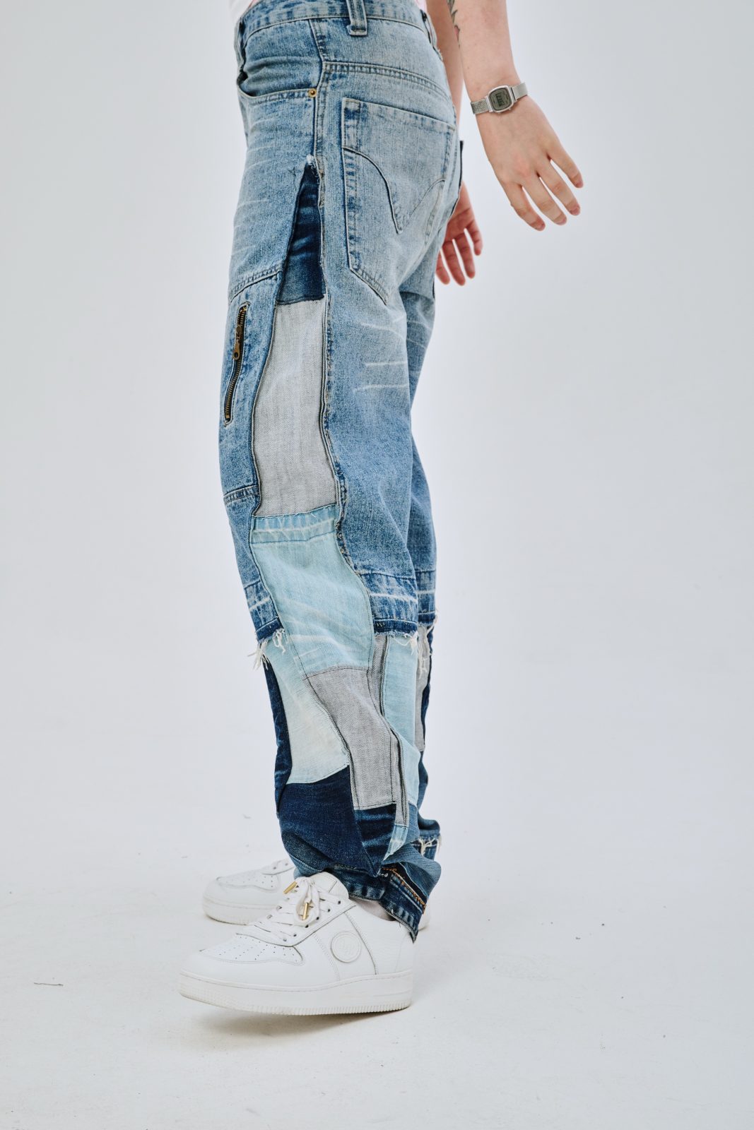 Сэмпл джинсов, выполненный вручную дизайнером distxrtedcustom. Шахматный орнамент на расширениях по бокам и в нижней части джинс. Строчки по бокам изделия придают геометрическую форму штанинам. Ручная работа и семпловый формат изделия объясняют привлекательную стоимость.