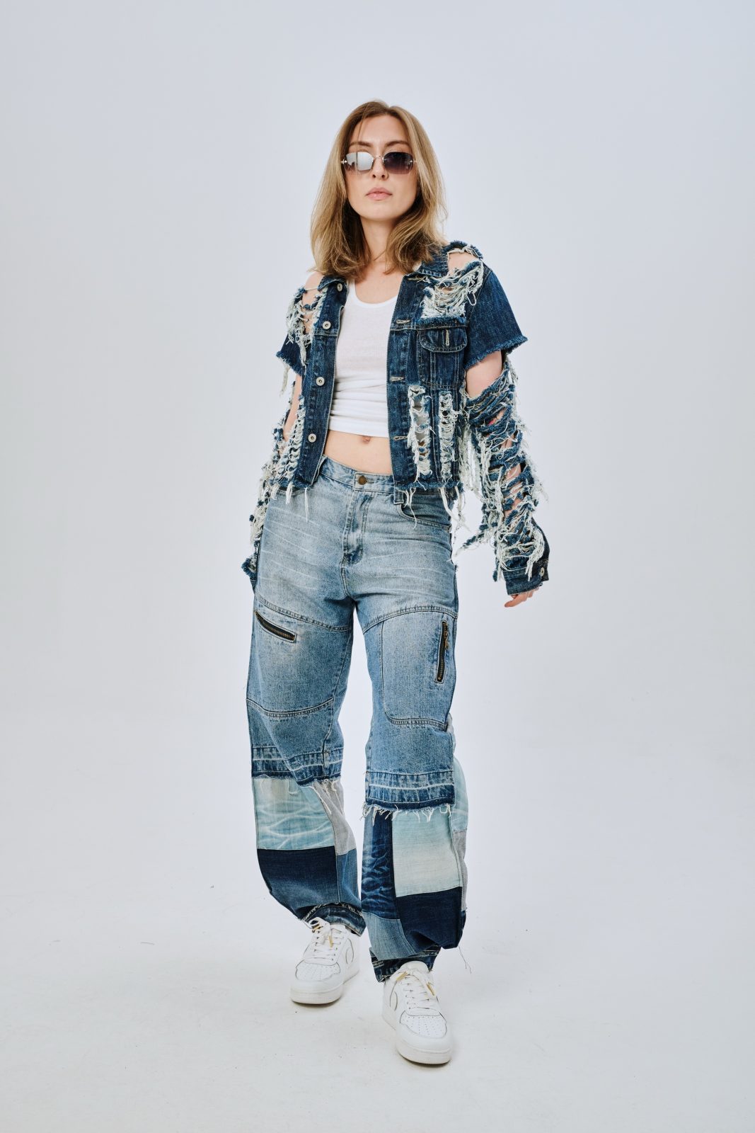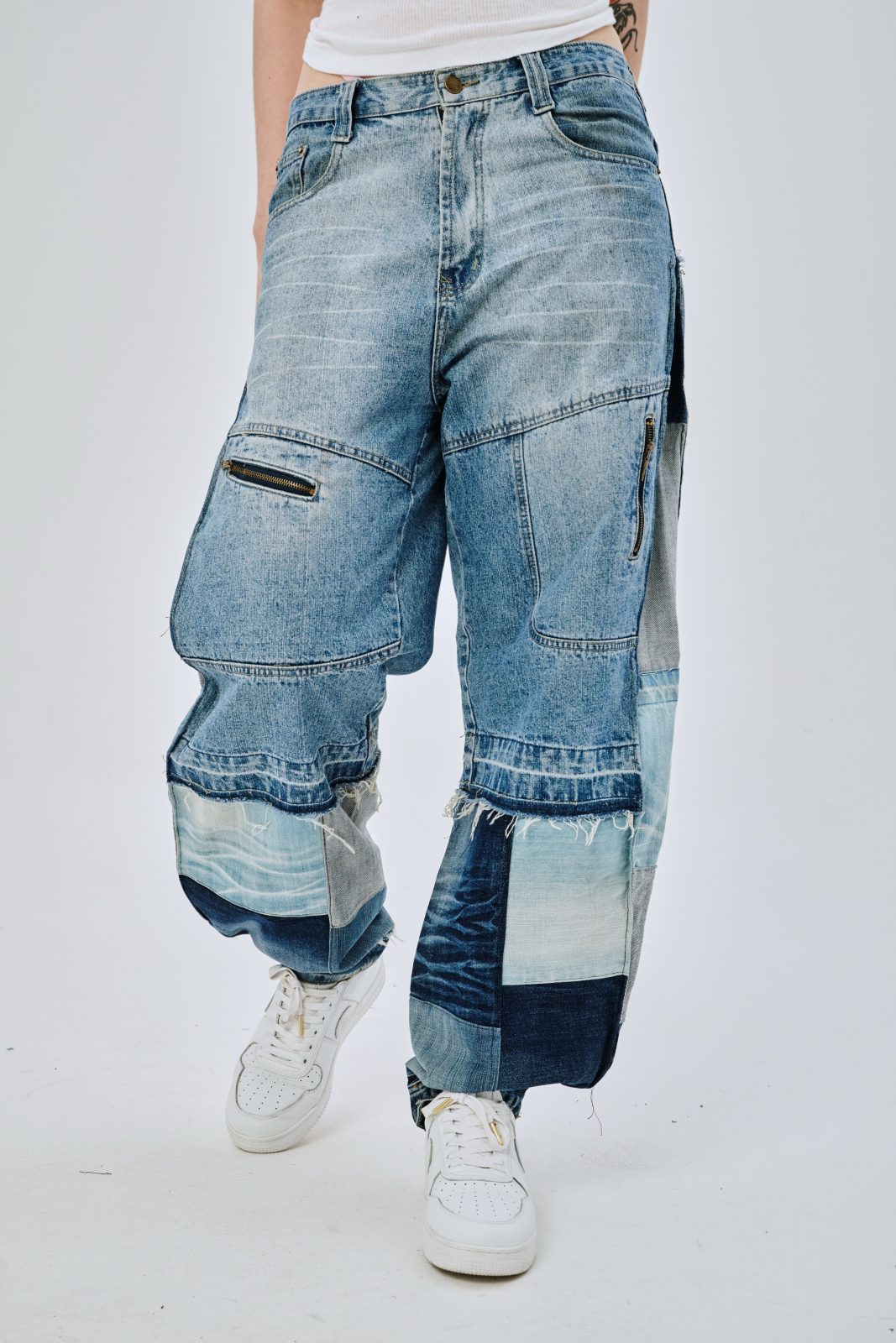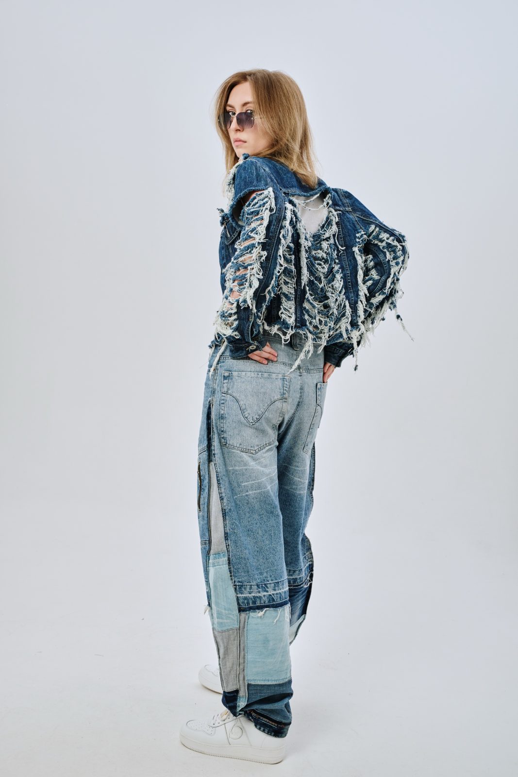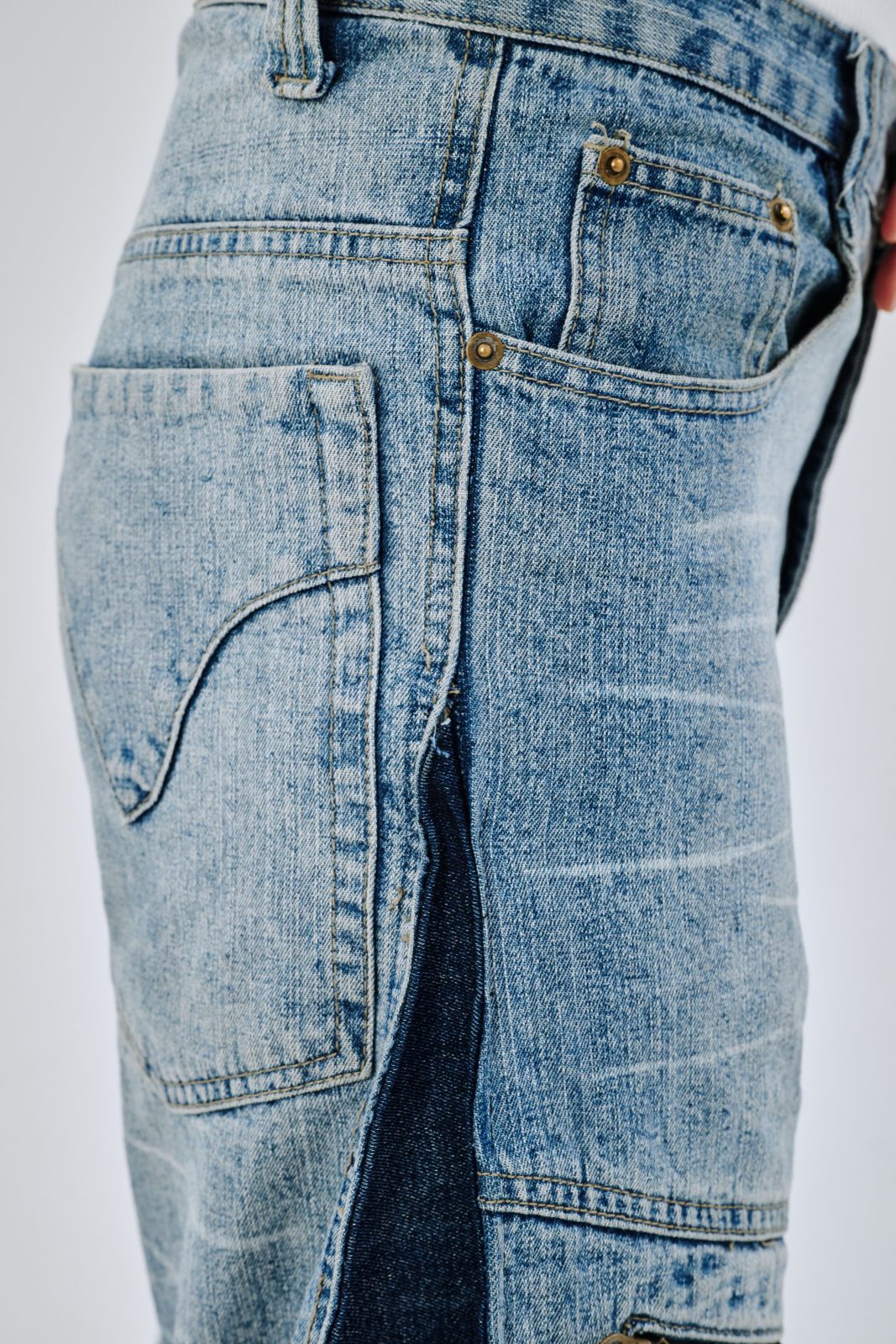 Сэмпл джинсов, выполненный вручную дизайнером distxrtedcustom. Шахматный орнамент на расширениях по бокам и в нижней части джинс. Строчки по бокам изделия придают геометрическую форму штанинам. Ручная работа и семпловый формат изделия объясняют привлекательную стоимость.