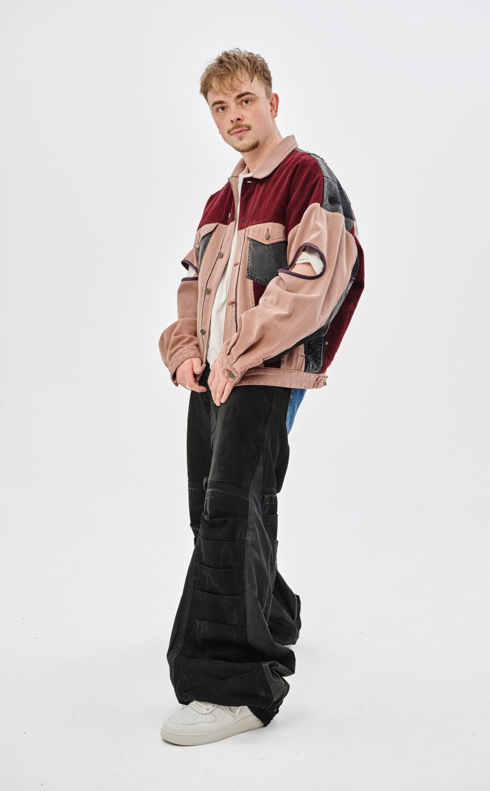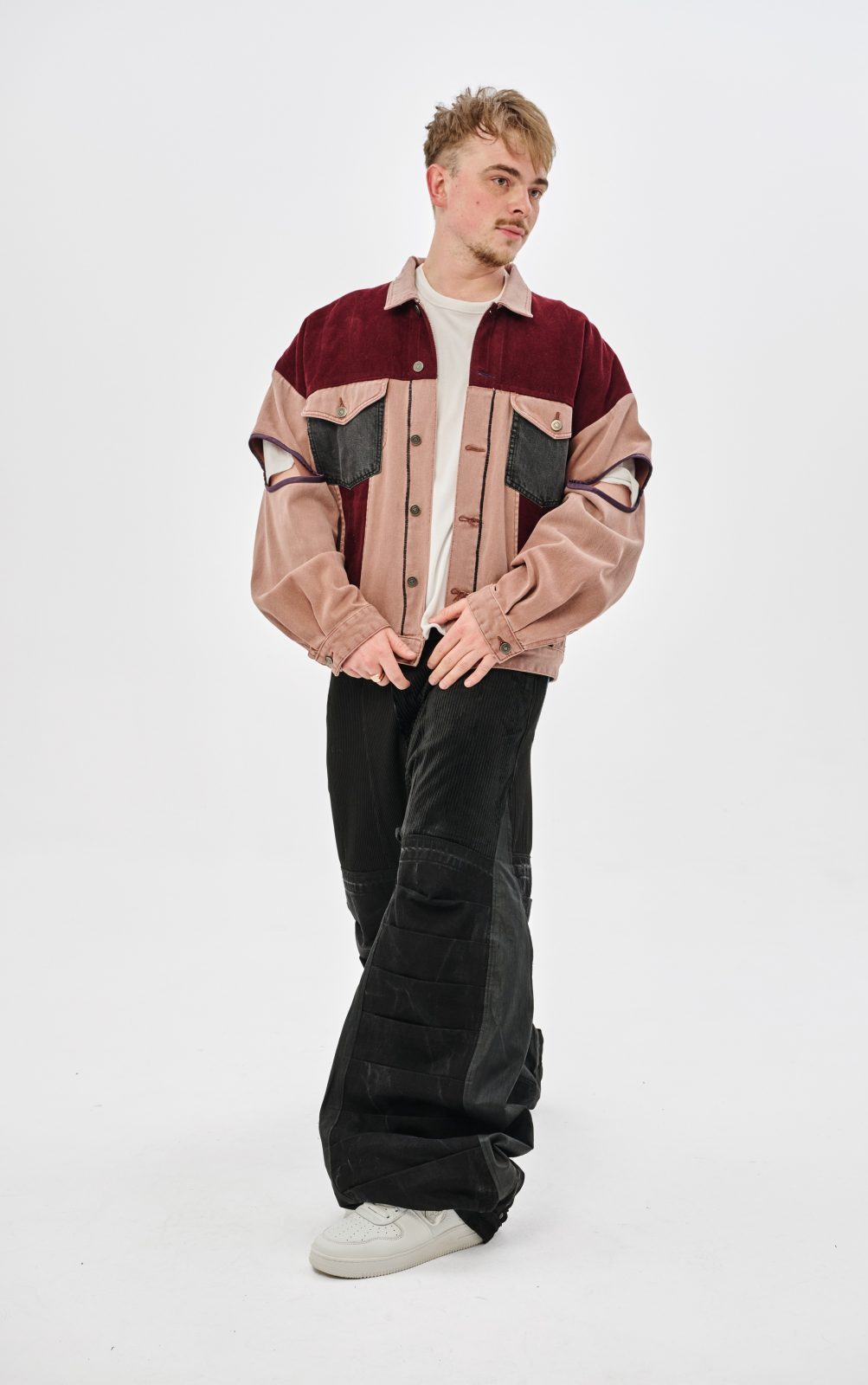 Куртка из редкого выцветшего розового денима дополнена бордовым вельветом на плечах и серой джинсой на спине. Геометрические узоры сзади разбавляют своими строгими линиями расслабленность посадки этой уникальной куртки от distxrtedcustom. Как следует из названия, куртка разрабатывалась для носки барабанщиками и не только, поэтому рукава украшают нестандартные отверстия, которые дают дополнительную вентиляцию или позволяют выставить руки наружу.