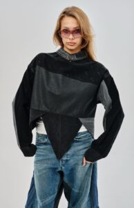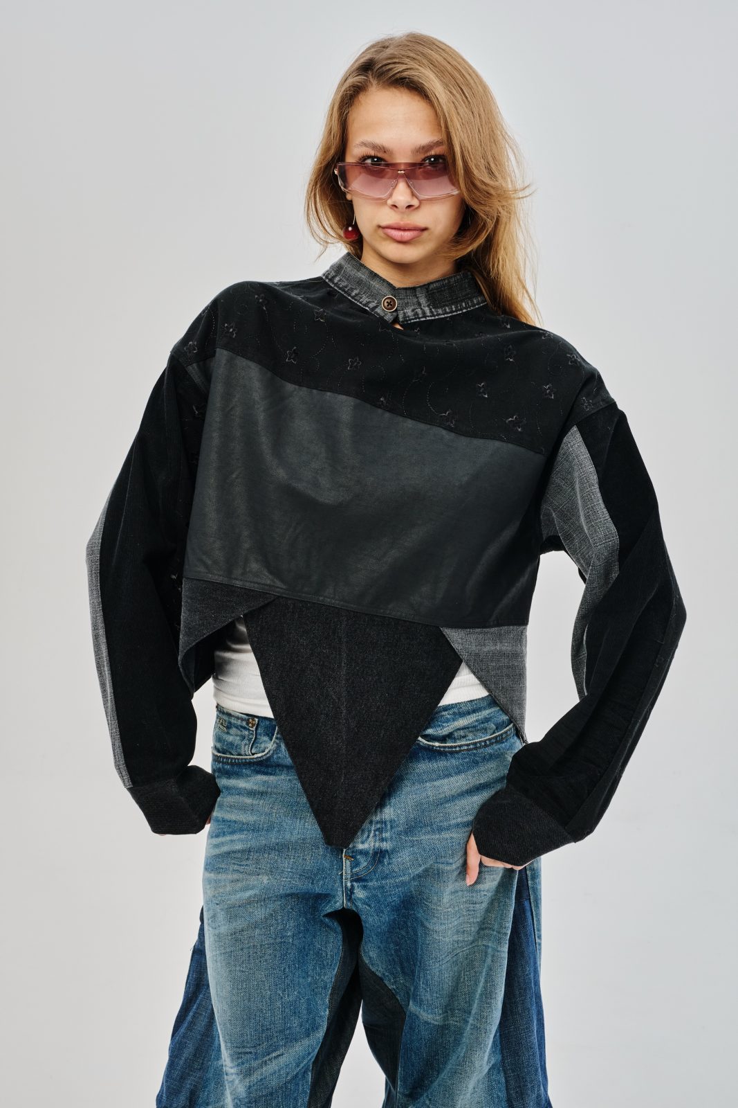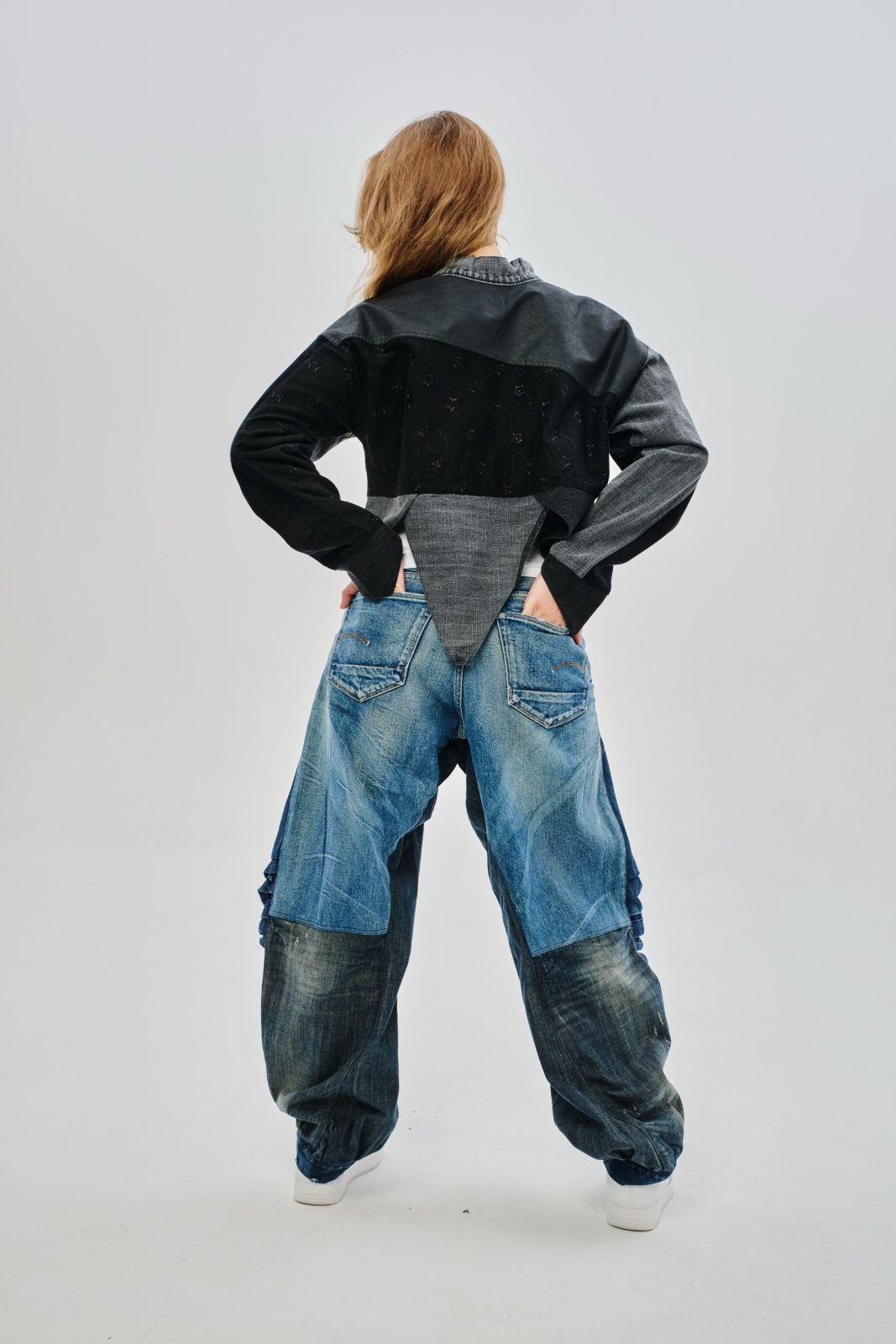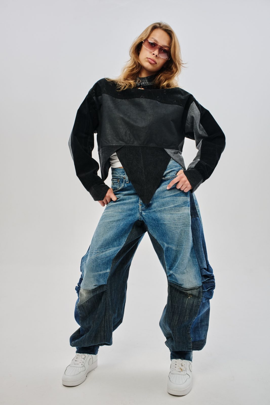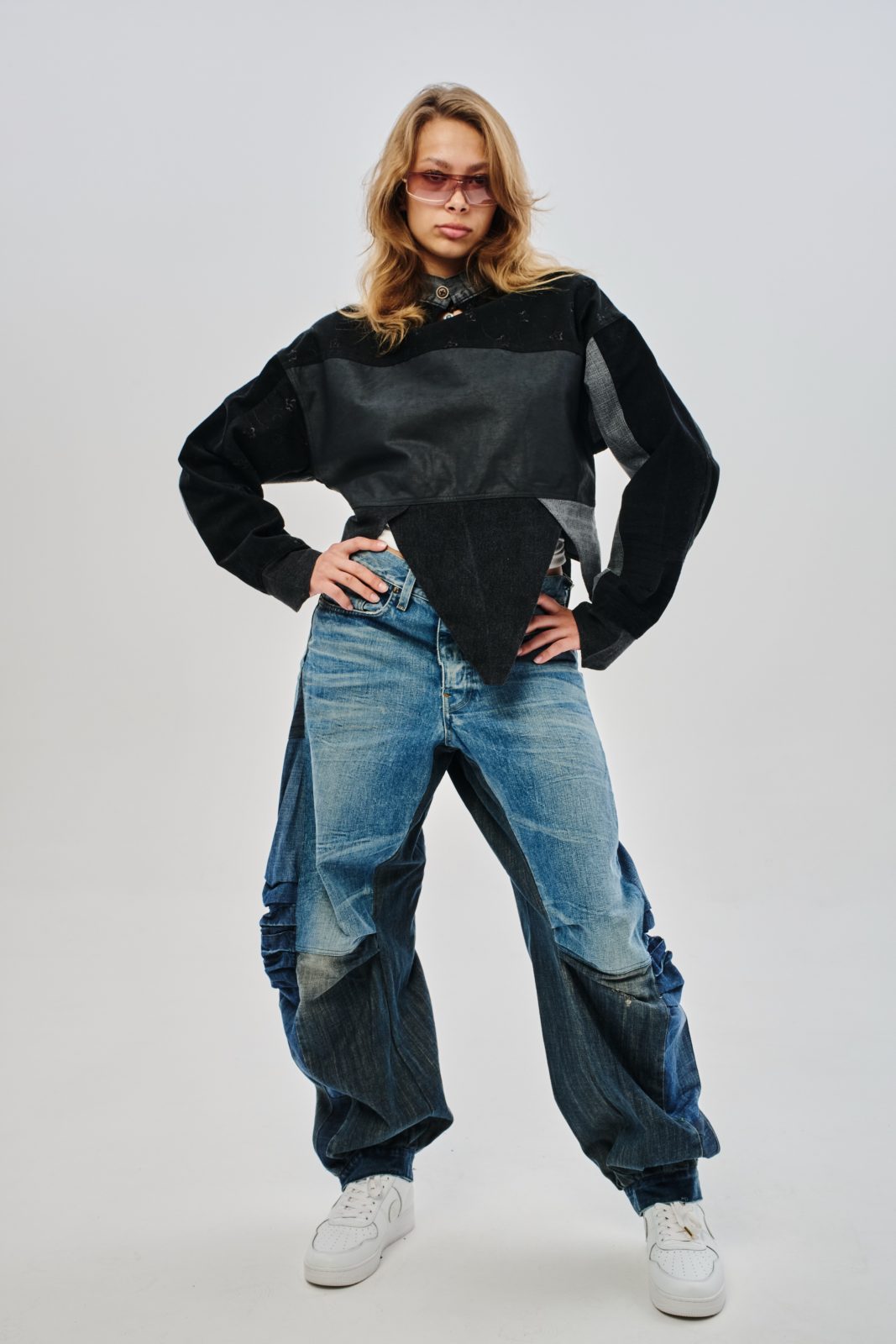 Аутентичный ассиметричный предмет одежды из денима и вельвета. Единственная в своем роде треугольная тема от distxrtedcustom, в которой не стыдно заявиться даже на Met Gala.