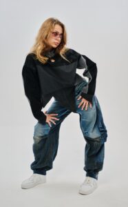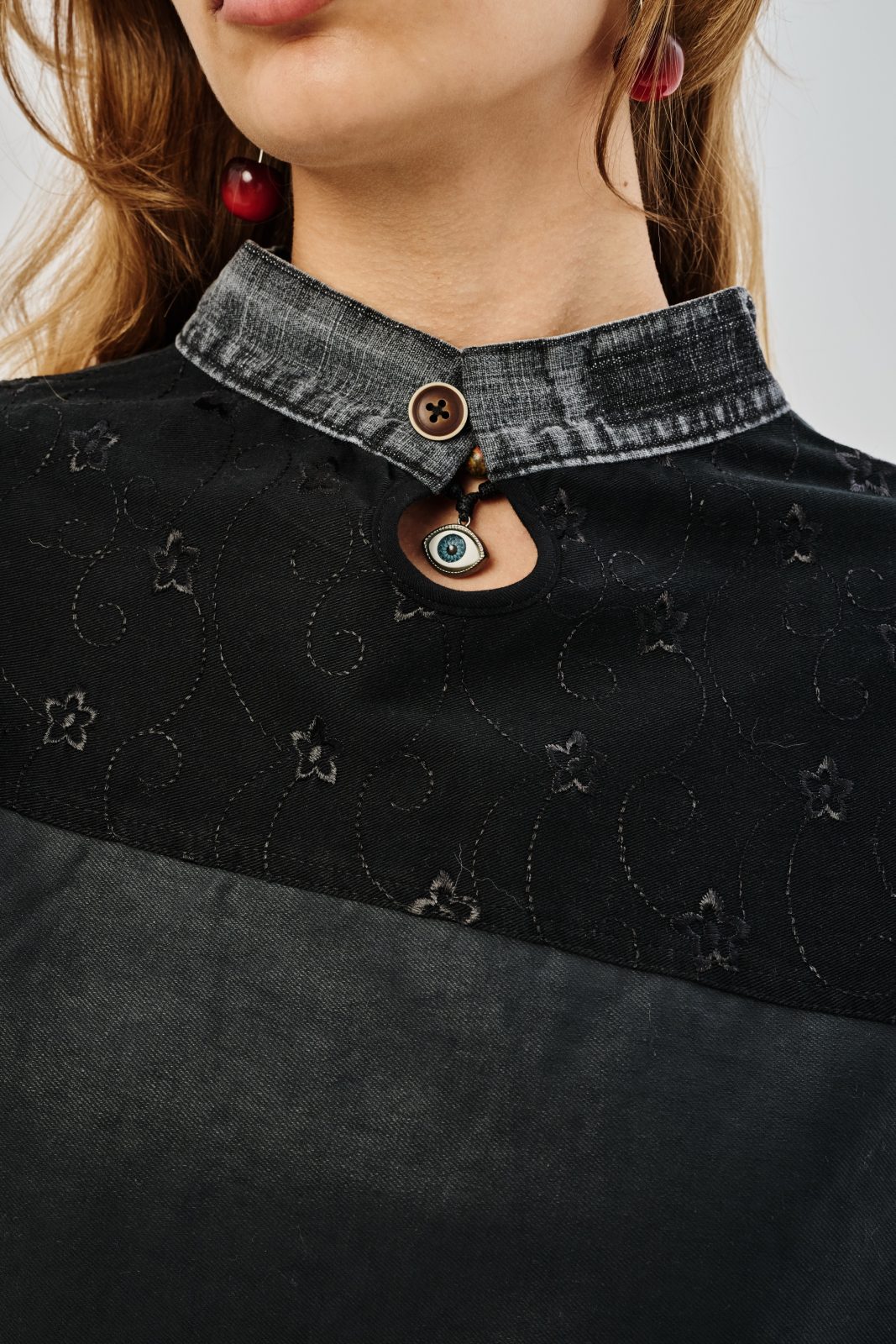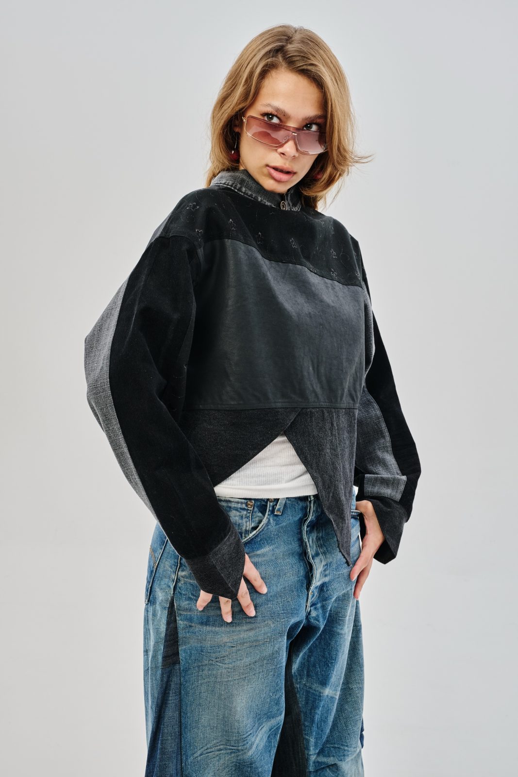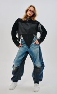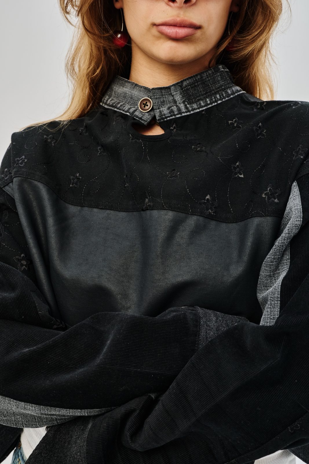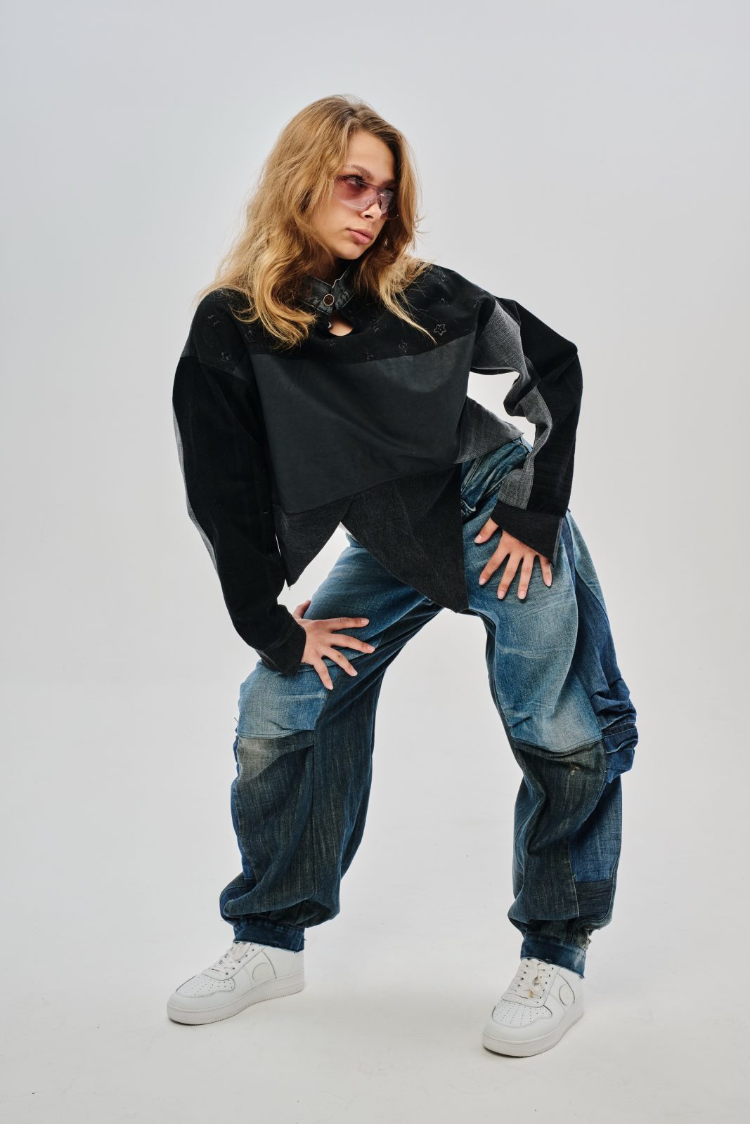 Аутентичный ассиметричный предмет одежды из денима и вельвета. Единственная в своем роде треугольная тема от distxrtedcustom, в которой не стыдно заявиться даже на Met Gala.